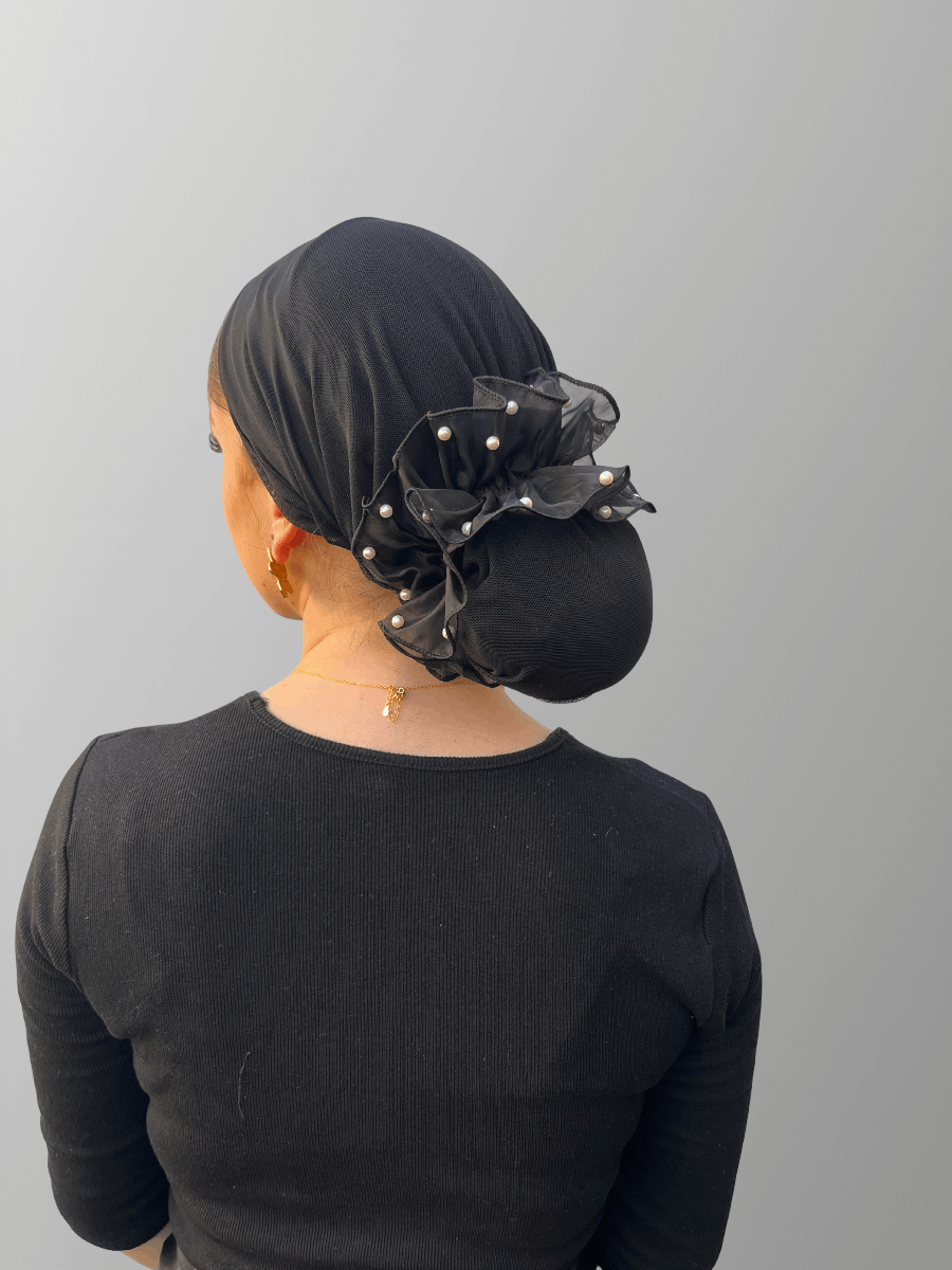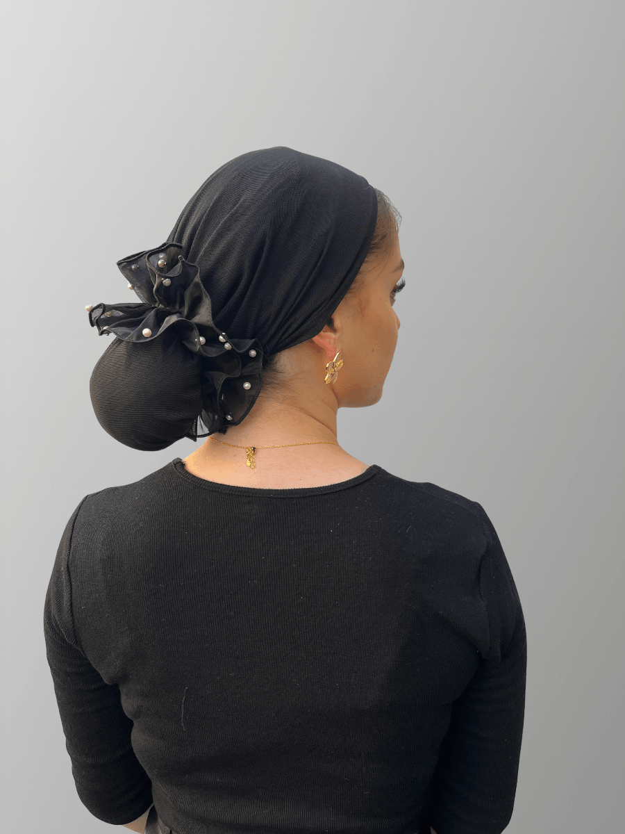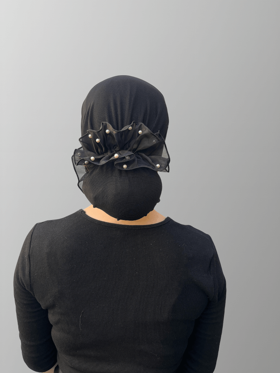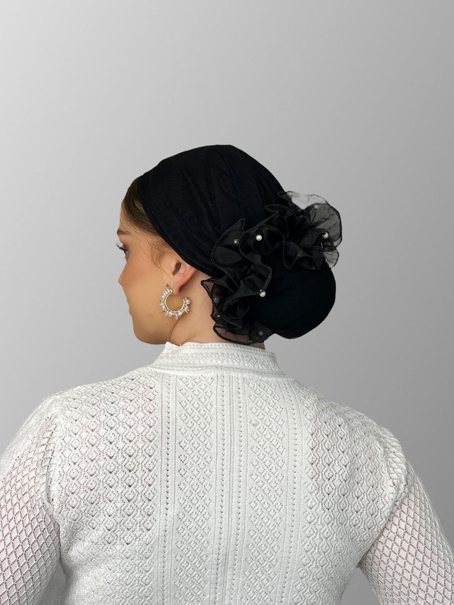 גומיה שחורה מבד טול עם פנינים וסיומת תלתל