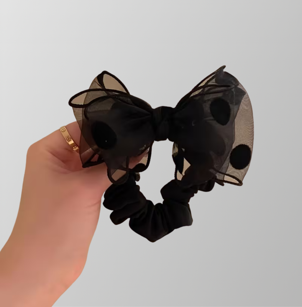 גומית פפיון שחורה בד טול עם טקסטורת עיגולי קטיפה