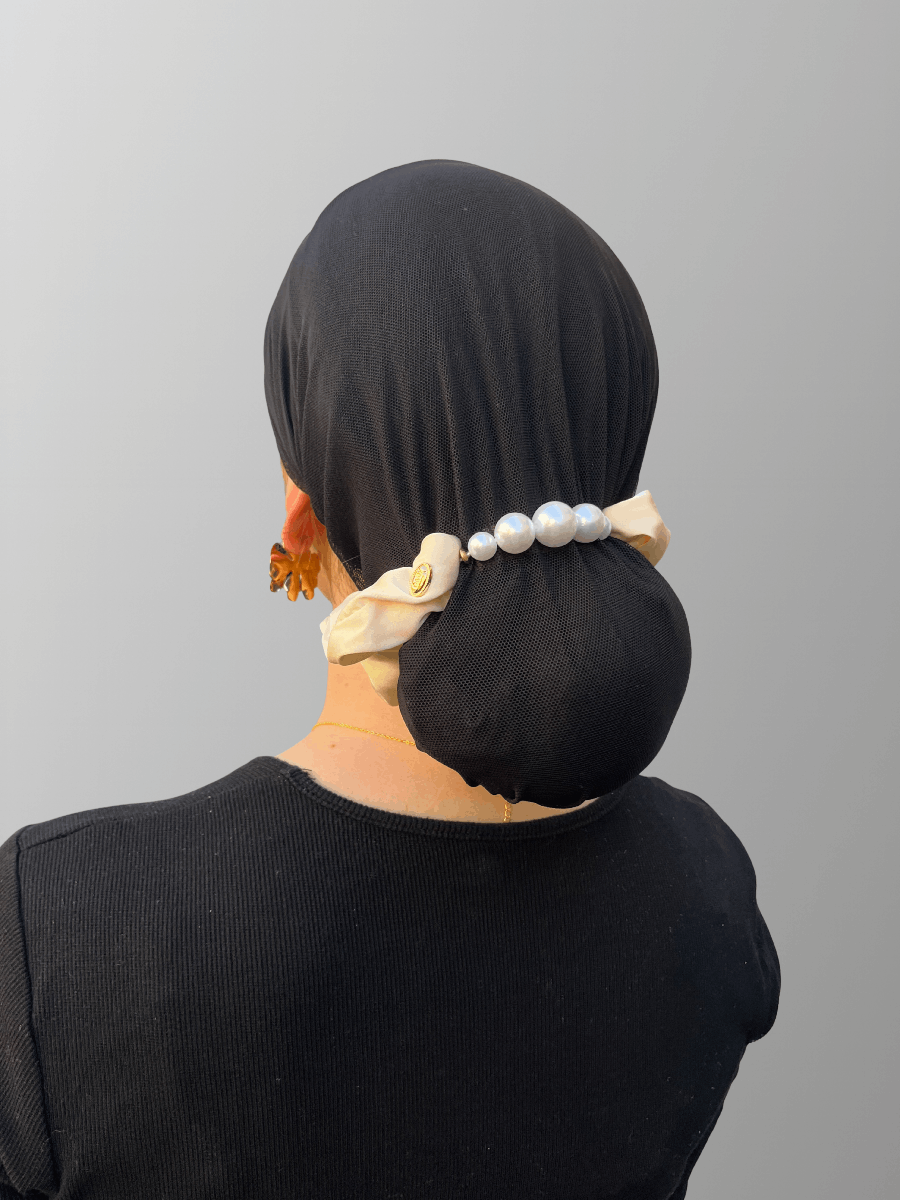 גומיה שמנת המורכבת מבד סאטן ושרשרת פנינים
