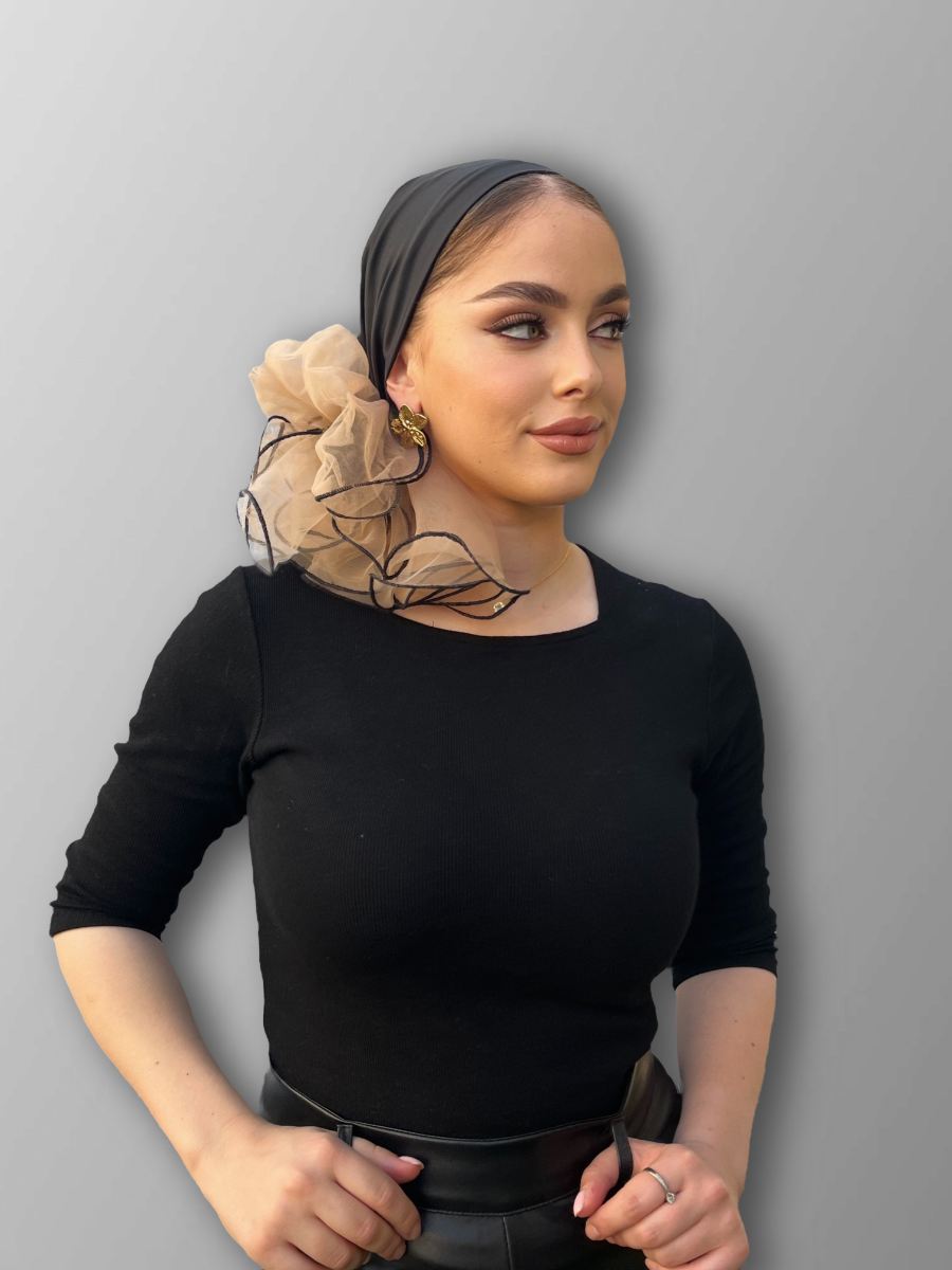 מטפחת סאטן שחורה משולבת עם שתי שכבות טול ב'ג בצדדי במטפחת