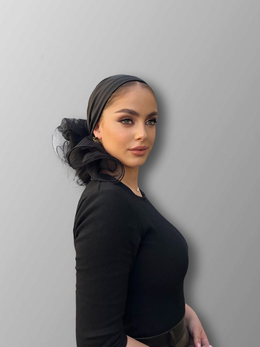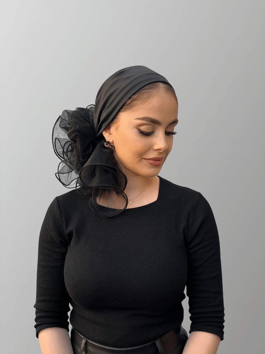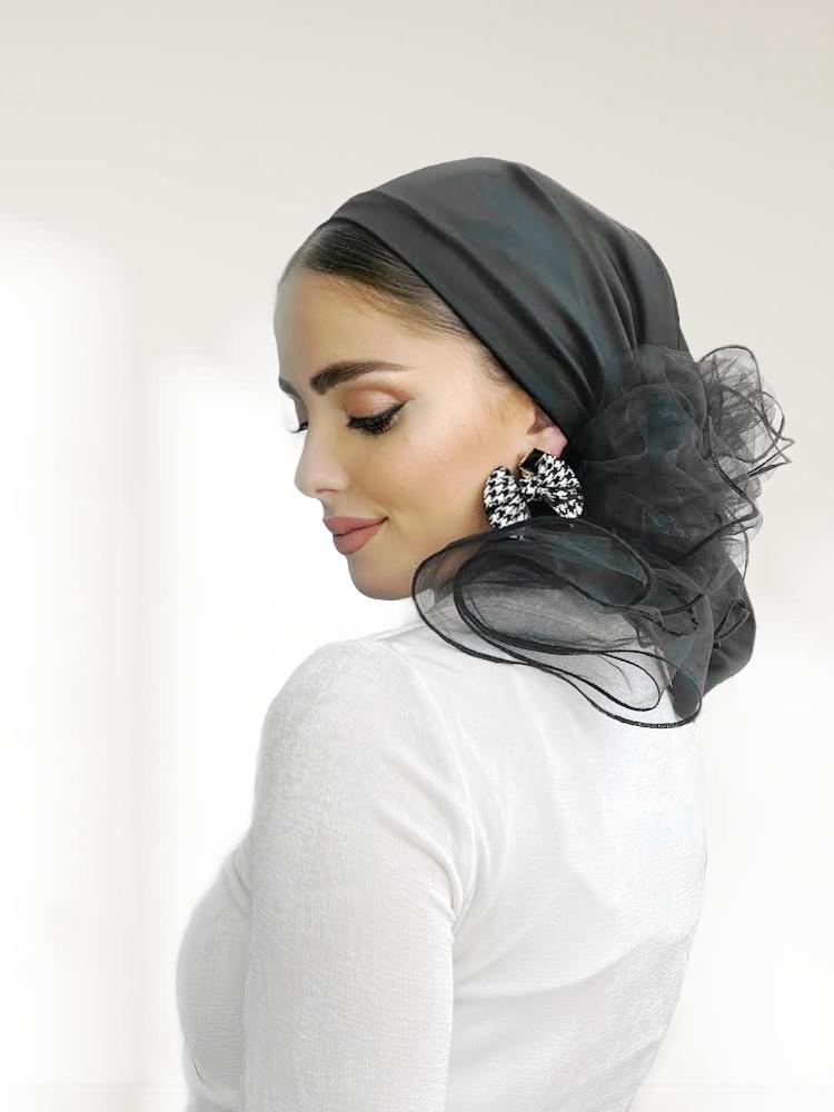 מטפחת סאטן שחורה משולבת עם שתי שכבות טול שחור בצדדי במטפחת