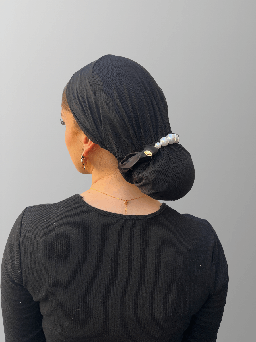 גומיה שחורה המורכבת מבד סאטן ושרשרת פנינים